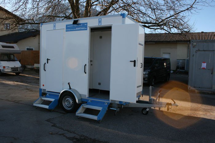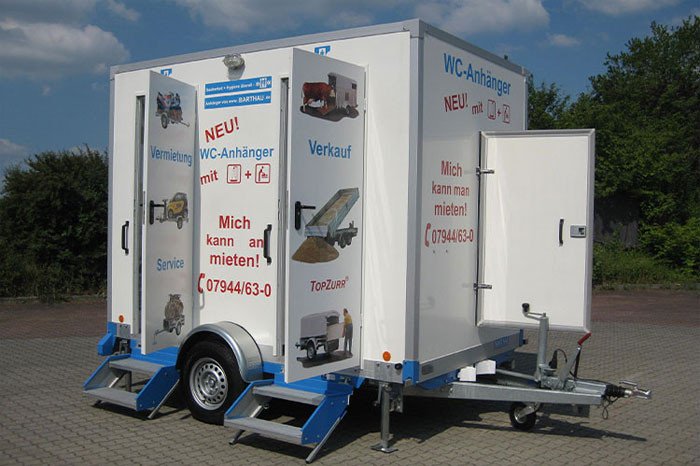 - Der Anhänger ist ausgestattet mit 2 Damen-WC, 1 Herren-WC und 1 Urinal
