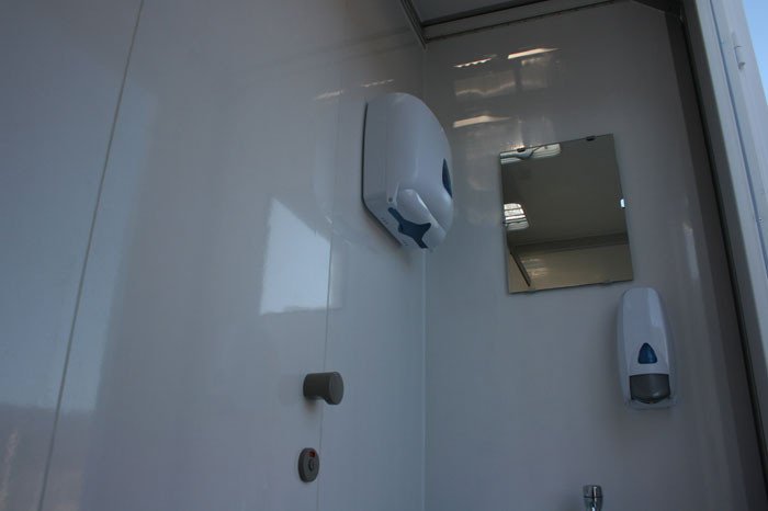 • Das Damen- und Herrenabteil sind mit qualitativ hochwertiger weißer Badkeramik ausgestattet. Jedes Abteil ist mit einem großzügigen Waschraum mit Porzellan- Waschbecken, Wasserhahn für Kaltwasser, einem Spiegel, verschiedenen Hygiene- Spendern (abschließbar) und einem Abfalleimer ausgestattet