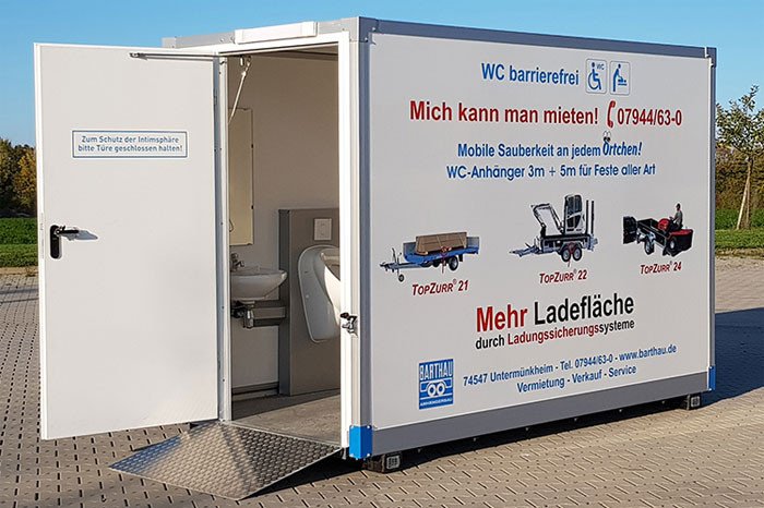 - Barthau WC-Container mit barierefreiem, rollstuhlgerechtem Zugang mit extra breiter Türe und flachem Auffahrwinkel