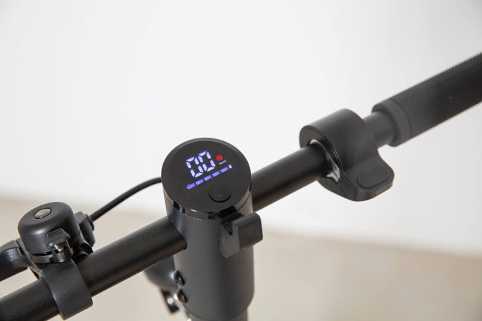 Auf dem LCD Display werden Ihre 3 Fahrstufen übersichtlich dargestellt. Der Scooter ES300 ist klappbar, dazu können Sie die Lenksäule einfach mit einem Haken am hinteren Kotflügel einhängen. Die LED Frontbeleuchtung mit Rückstrahler sowie das Rücklicht das beim Bremsen blinkt und der hintere Rückstrahler sind StVO konform. An der Gabel zum Vorderrad sind die vorgeschriebenen seitlichen Rückstrahler befestigt.