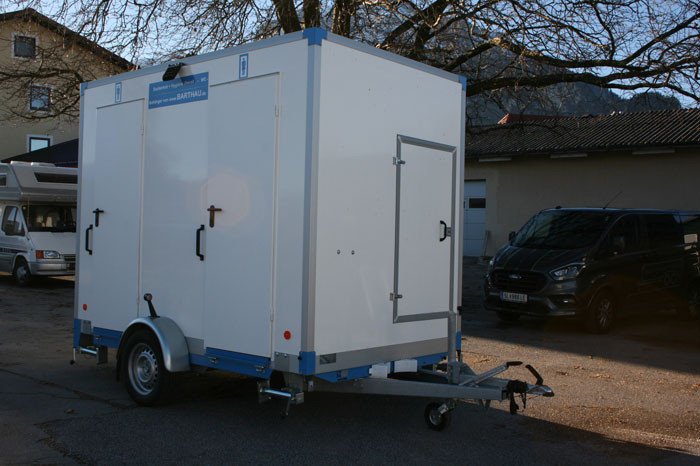 Niedriger Einstieg in die beiden getrennten Damen und Herren Abteile. Mit 2 Trittstufen ist der Anhänger auch für ältere Menschen und Kinder leicht begehbar. Die Stufen können auf unebenem Gelände abgestützt werden. Während der Fahrt werden die Stufen in den Anhänger hochgeklappt.