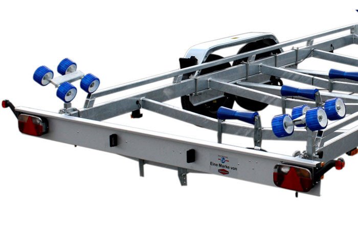 Tandem Bootsanhänger mit Vierfachrollen und Kurbelstützen