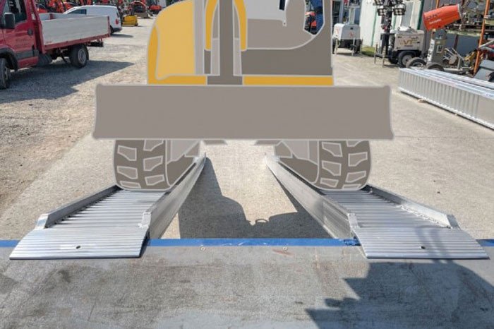 Beispiele für den Einsatz sind Traktoren, Bagger, Schaufelbagger, Radlader und Arbeitsbühnen. Die Rampen sind in verschiedenen Breiten und Kopfausführungen erhältlich.