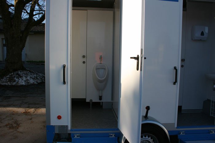- Der Anhänger ist ausgestattet mit 2 Damen-WC, 1 Herren-WC und 1 Urinal