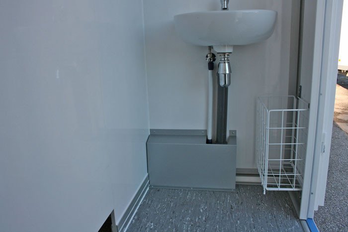 - Das Damen- und Herrenabteil sind mit qualitativ hochwertiger weißer Badkeramik ausgestattet. Jedes Abteil ist mit einem großzügigen Waschraum mit Porzellan- Waschbecken, Wasserhahn für Kaltwasser, einem Spiegel, verschiedenen Hygiene- Spendern (abschließbar) und einem Abfalleimer ausgestattet