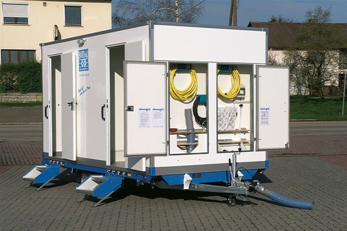 • Der Anhänger ist ausgestattet mit 4 Toiletten, 3 Urinale, 2 Waschbecken
