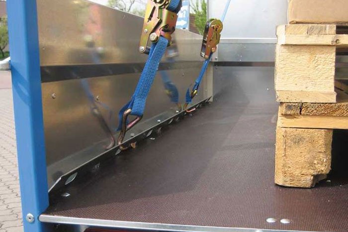 Die Ladungssicherung ist optimal direkt mit dem Rahmen verschraubt. Es kann über die gesamte Anhängerlänge eine Anbindung mittels Zurrgurten stattfinden.