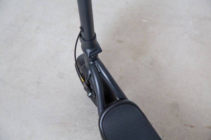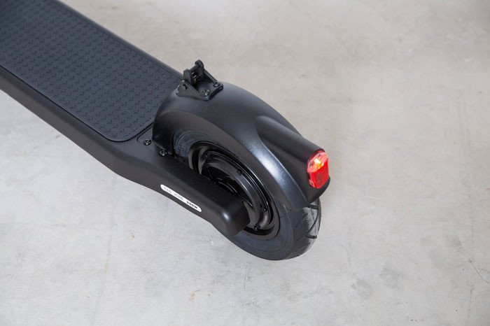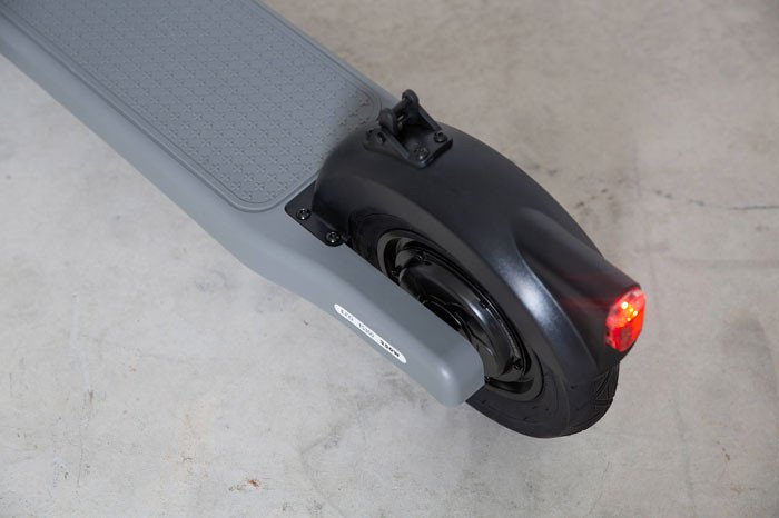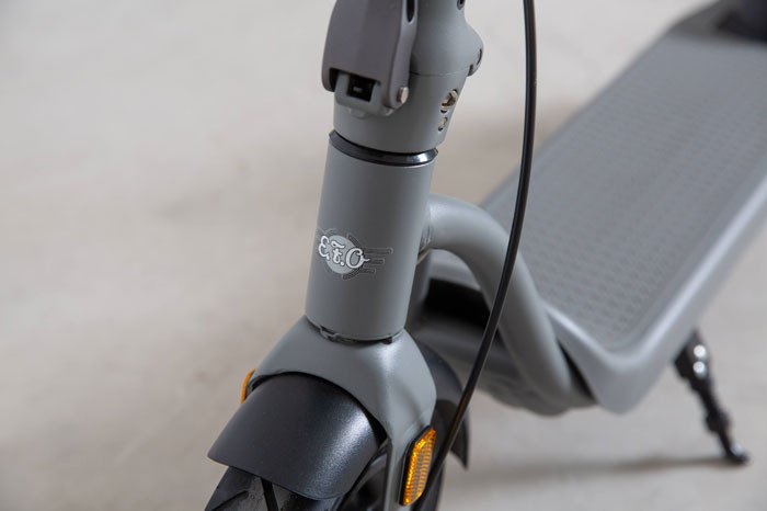 Auf dem LCD Display werden Ihre 3 Fahrstufen übersichtlich dargestellt. Der Scooter ES300 ist klappbar, dazu können Sie die Lenksäule einfach mit einem Haken am hinteren Kotflügel einhängen. Die LED Frontbeleuchtung mit Rückstrahler sowie das Rücklicht das beim Bremsen blinkt und der hintere Rückstrahler sind StVO konform. An der Gabel zum Vorderrad sind die vorgeschriebenen seitlichen Rückstrahler befestigt.