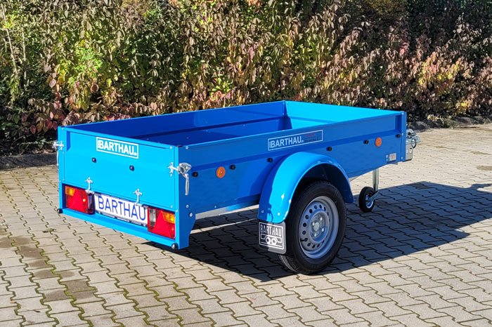 Ein optisches Highlight ist der KFZ Anhänger, Autoanhänger in Himmelblau mit den passenden Kotflügeln