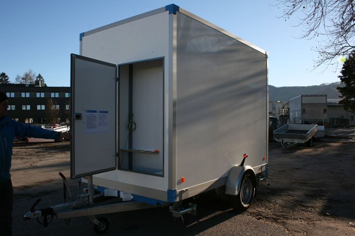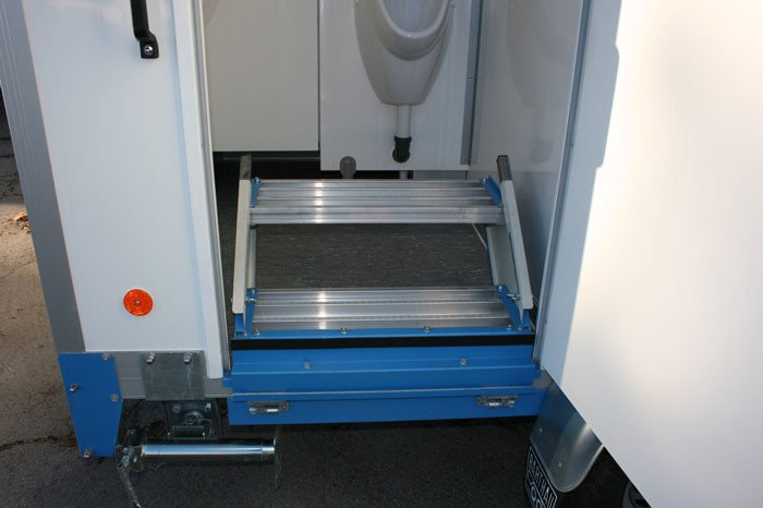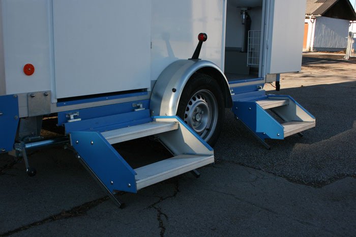 Niedriger Einstieg in die beiden getrennten Damen und Herren Abteile. Mit 2 Trittstufen ist der Anhänger auch für ältere Menschen und Kinder leicht begehbar. Die Stufen können auf unebenem Gelände abgestützt werden. Während der Fahrt werden die Stufen in den Anhänger hochgeklappt.