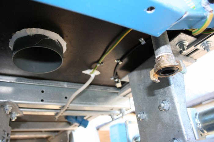 Abschließbare Servicebox mit Sicherungskasten und Halterungen für Schläuche und Elektrokabel.