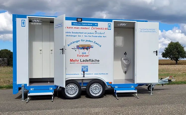 Niedriger Einstieg in die beiden getrennten Damen und Herren Abteile. Mit 2 Trittstufen ist der Anhänger auch für ältere Menschen und Kinder leicht begehbar. Die Stufen können auf unebenem Gelände abgestützt werden. Während der Fahrt werden die Stufen in den Anhänger hochgeklappt.