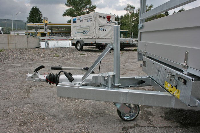 Extra starkes Automatik Stützrad ø 60 mm auf Deichsel montiert, für ein sicheres Abstellen und Rangieren des Anhängers