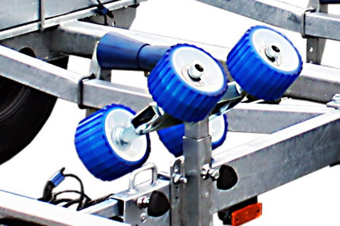 Kielrollen: 4 höhenverstellbare V-Rollen aus blauem Polyvinyl, 1 Anlaufrolle aus blauem Polyvinyl